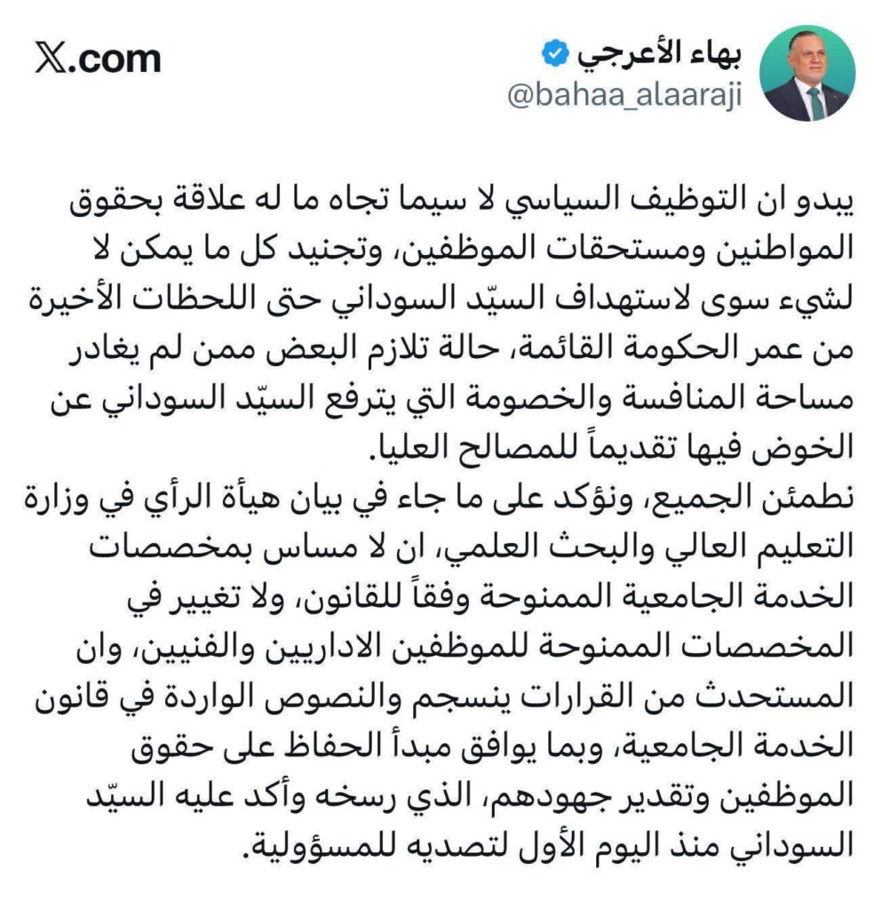 عد النائب عن ائتلاف الاعمار والتنمية بهاء الأعرجي، اليوم السبت (24 كانون الثاني 2026)، تظاهرات موظفي التعليم العالي، وظفت سياسياً، لاستهداف رئيس مجلس الوزراء محمد شياع السوداني، مشدداً على أنه لا يوجد مساس بحقوق الموظفين، وهو الأمر الذي رسخه رئيس الوزراء منذ اليوم الأول لتصديه المسؤولية.