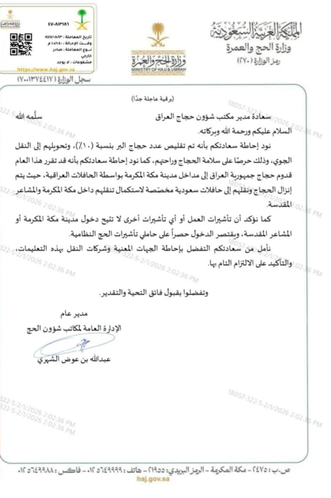 كما جاء في الكتاب، أنه “تقرر هذا العام قدوم حجاج جمهورية العراق إلى مداخل مدينة مكة المكرمة بواسطة الحافلات العراقية، حيث يتم إنزال الحجاج ونقلهم إلى حافلات سعودية مخصصة لاستكمال تنقلهم داخل مكة المكرمة والمشاعر المقدسة”.