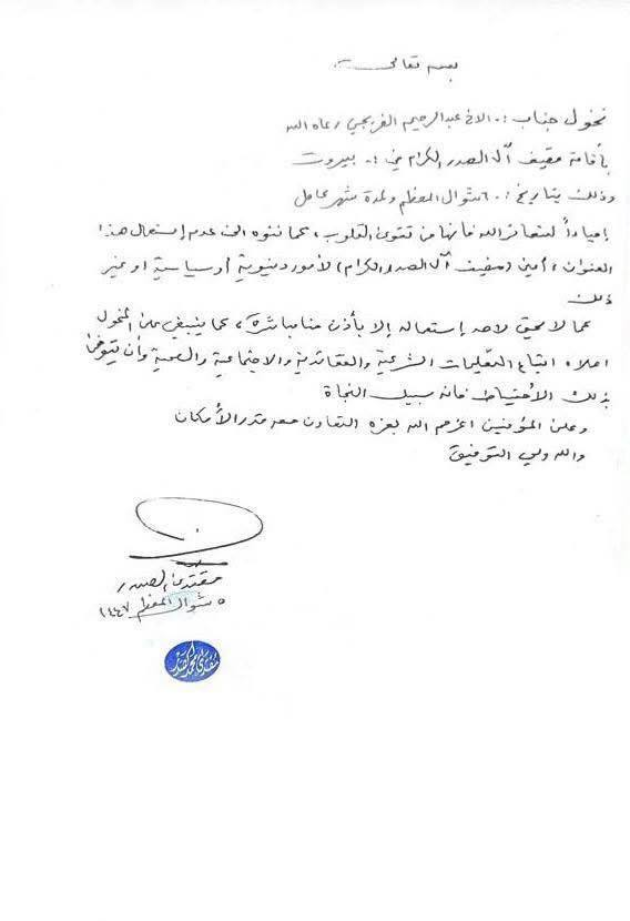أصدر زعيم التيار الوطني الشيعي، مقتدى الصدر، اليوم الأربعاء 25 آذار 2026، تخويلاً لإقامة مضيف آل الصدر في العاصمة اللبنانية بيروت اعتباراً من 6 شوال ولمدة شهر، مؤكداً عدم استغلال المضيف لأغراض دنيوية أو سياسية، ومشدداً على أنه لا يجوز استعماله إلا بإذنه الشخصي.