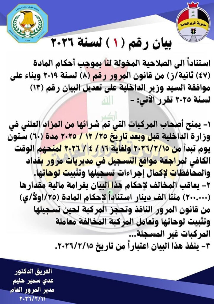 أصدرت مديرية المرور العامة، مجموعة من القرارات، من بينها منح أصحاب المركبات التي تم شراؤها من المزاد العلني في وزارة الداخلية قبل وبعد تاريخ 25 كانون الأول 2025، مدة 60 يوماً تبدأ من 15 شباط الجاري ولغاية 16 نيسان، وذلك من أجل منحهم الوقت الكافي لمراجعة مواقع التسجيل في مديريات مرور بغداد والمحافظات وإكمال إجراءات تسجيلها وتثبيت لوحاتها.