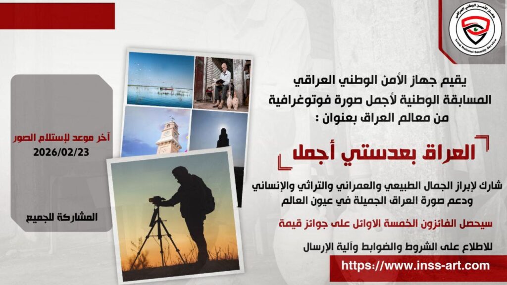 يُعلن جهاز الأمن الوطني العراقي، بالتعاون مع الجمعية العراقية للتصوير – المركز العام، عن إطلاق مسابقة وطنية للتصوير الفوتوغرافي بعنوان «العراق بعدستي أجمل»، تهدف إلى إبراز جمال العراق وهويته الحضارية والإنسانية، وتسليط الضوء على معالمه الأثرية والطبيعية.