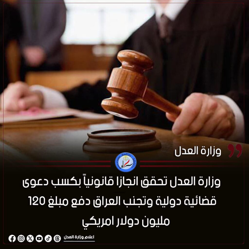وزارة العدل تحقق انجازا قانونياً بكسب دعوى قضائية دولية وتجنب العراق دفع مبلغ 120 مليون دولار امريكي